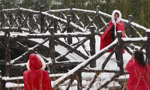 11月7日,北京北土城公园,市民在雪中拍照留念。中国日报记者 张威 摄