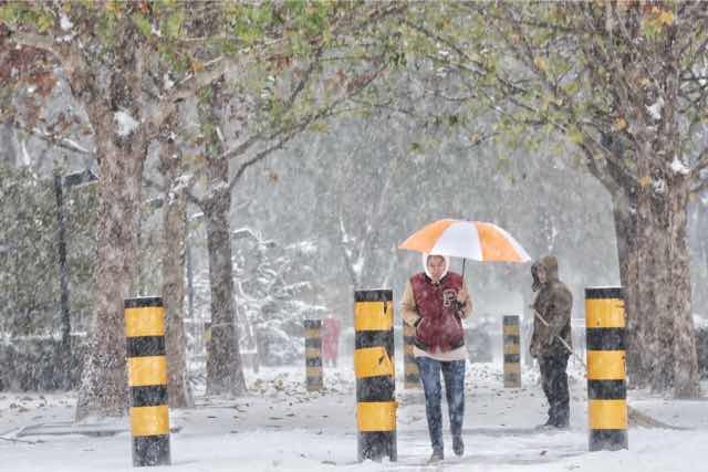 11月7日,北京市朝阳区东坝地区,市民冒雪出行。中国日报记者 姜东 摄