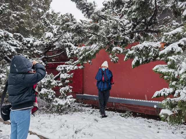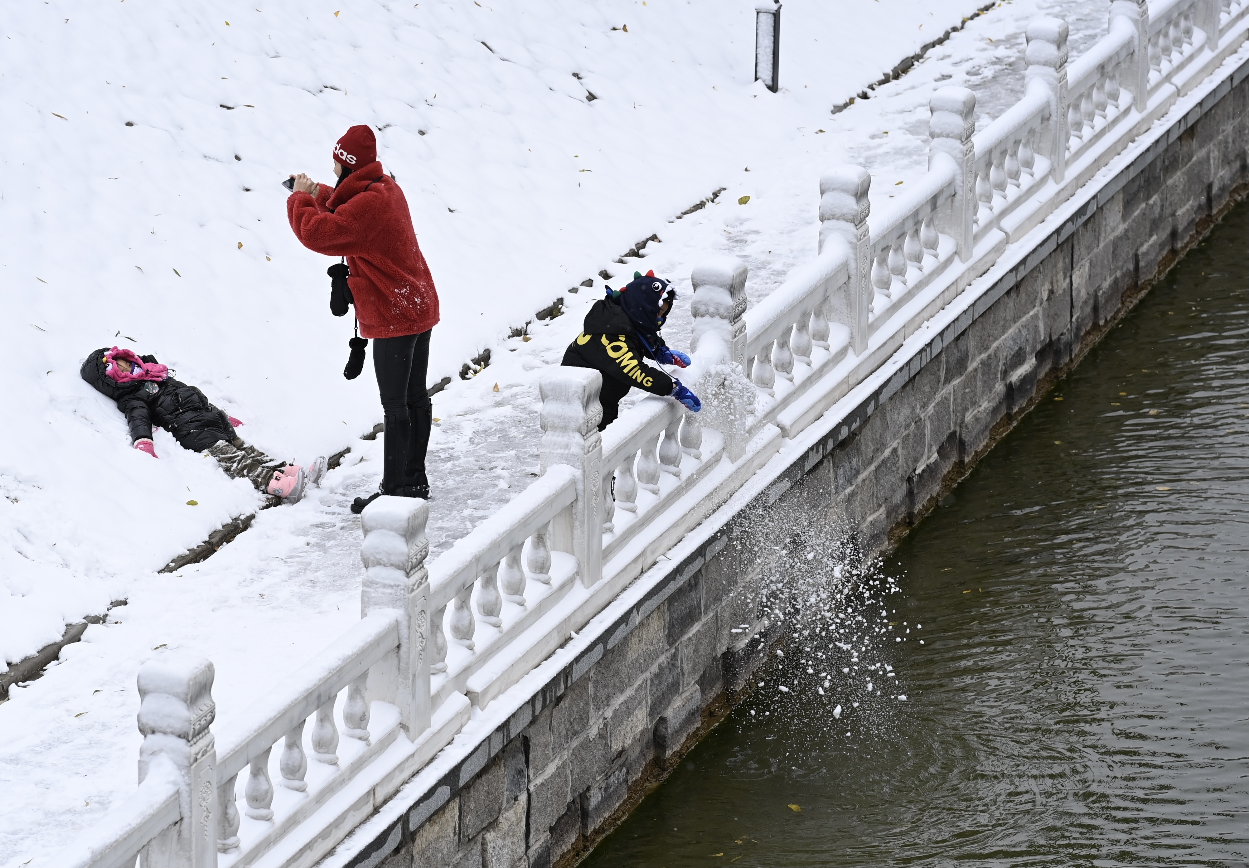 11月7日,北京北海公园附近,市民在雪中拍照留念。中国日报记者 王敬 摄