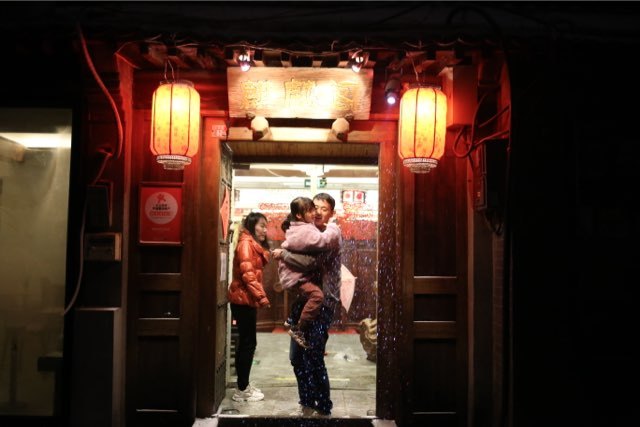 11月6日晚,北京市东城区,顾客在雪夜里从一家餐馆走出。中国日报记者 武晓慧 摄