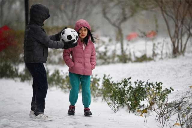 11月7日,北京市海淀区一小区,两名小朋友在雪中玩球。中国日报记者 魏晓昊 摄