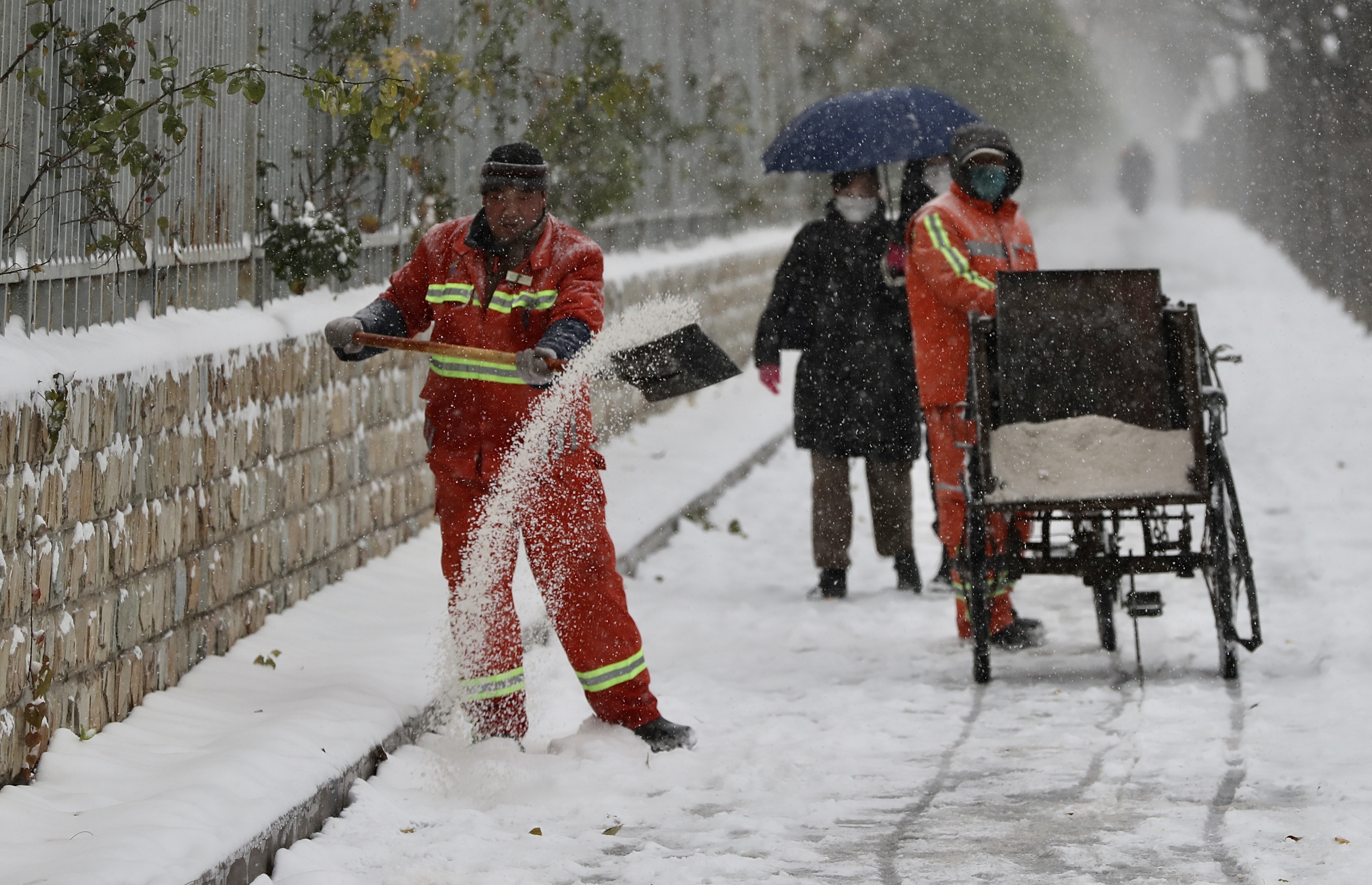 11月7日,北京市朝阳区北土城西路,环卫工人撒融雪剂。中国日报记者 张威 摄