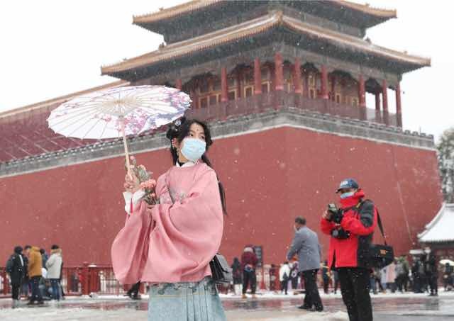 11月7日,一名身着汉服的女子雪中游览北京故宫。中国日报记者 邹红 摄