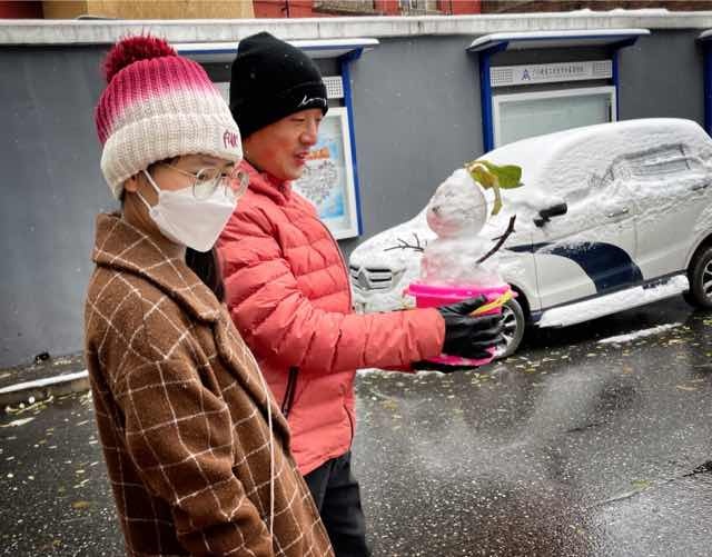 11月7日,北京市西城区,市民抱着自己堆的小雪人,乐趣十足。中国日报记者 杜涟猗 摄