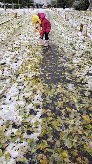 11月7日,北京市海淀区一小区,一名小朋友清扫门前积雪。中国日报记者 耿菲菲 摄