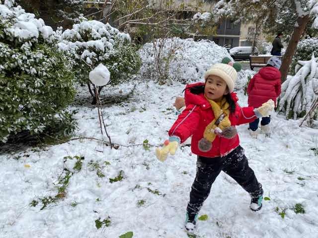 11月7日,北京市海淀区一小区,小朋友们在雪中嬉戏。中国日报记者 耿菲菲 摄