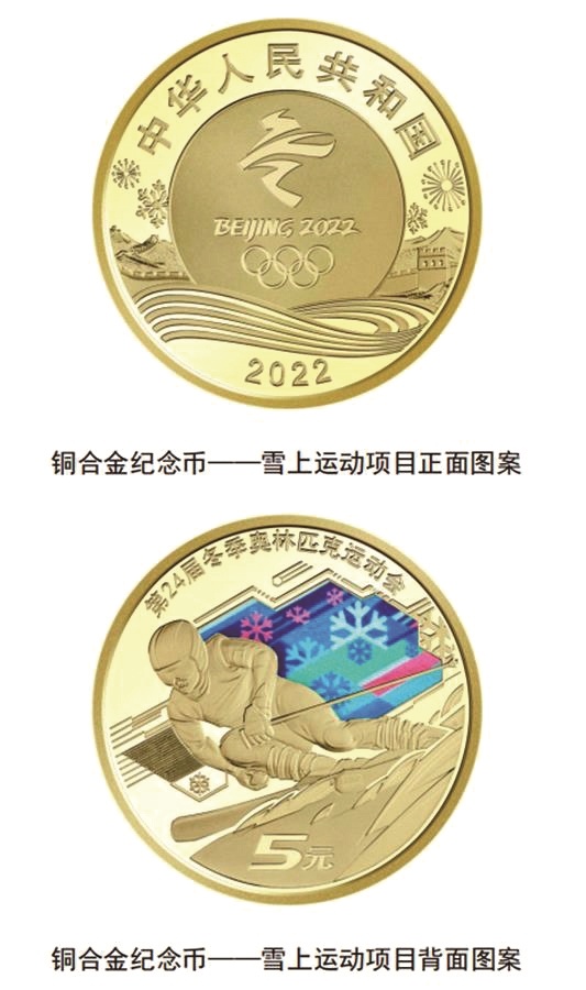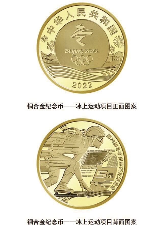 根据央行公告,此次发行的冬奥会普通纪念币包括冰上运动项目和雪上运动项目铜合金纪念币各1枚。该套铜合金纪念币正面主景图案均为第24届冬季奥林匹克运动会会徽,辅以图案化的北京冬奥会比赛场馆、长城、雪山等元素,币面上方刊“中华人民共和国”国名,下方刊年号“2022”字样;冰上运动项目背面主景图案为短道速滑运动员形象,背景为抽象化的线条等组合元素,并刊“第24届冬季奥林匹克运动会”字样及面额。雪上运动项目背面主景图案为高山滑雪运动员形象,背景图案为高山、雪花,局部为彩色图案,并刊“第24届冬季奥林匹克运动会”字样及面额。