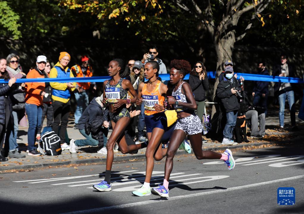 11月7日,肯尼亚选手杰普契奇尔(右)、切普图(左)、埃塞俄比亚选手耶沙内在比赛中。最终,她们分获冠、亚、季军。