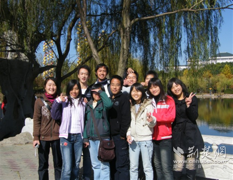 本科时期的刘磊磊(前排中)与系学生会成员一起在晨光湖畔合影留念。通讯员供图