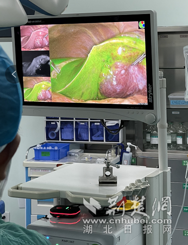 荆楚网(湖北日报网)讯(记者 黄涛 通讯员 谢靖 刘霞)“注射荧光剂,连接转化荧光设备……”随着主刀医生张斌豪教授的指令,屏幕上原本红色的肝脏,逐渐变成了翠绿色,这神奇的一幕正是发生在同济天佑医院/武汉科技大学附属天佑医院的手术室里。近日,该院肝胆胰外科张斌豪教授团队成功实施吲哚菁绿荧光染色反选腹腔镜下肝肿瘤切除术,为患者切除掉12cm巨大肿瘤。术后不到24小时患者就可以下地活动,恢复效果良好。