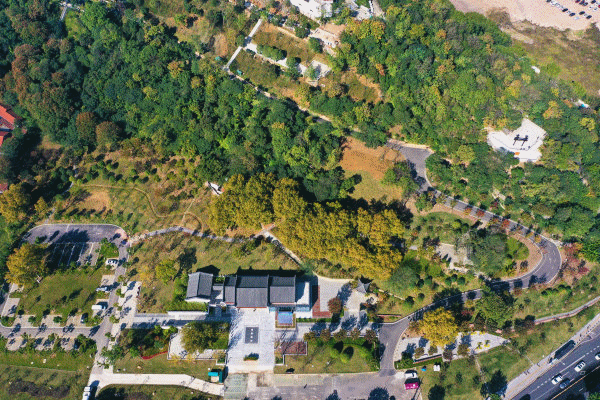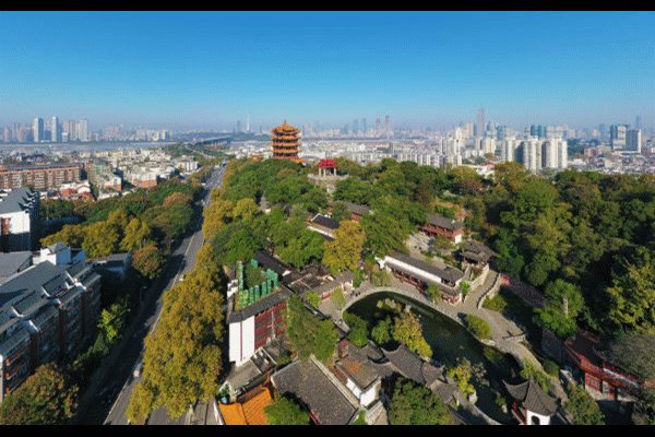 鸟瞰武昌蛇山,绵延数公里的山林色彩多样,或黄或绿或红,映衬着黄鹤楼公园景色迷人;远眺长江两岸,壮丽无比。