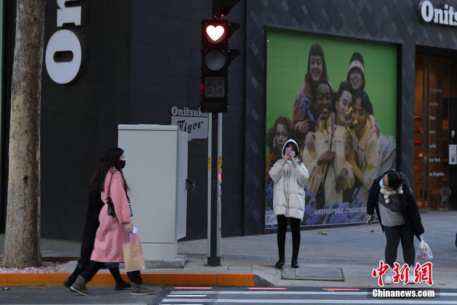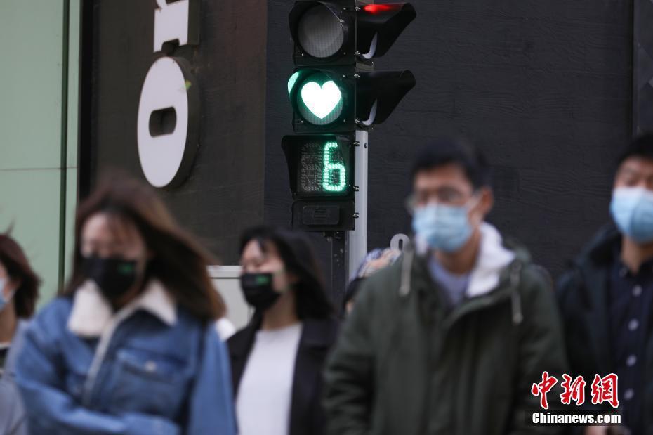 11月11日,民众经过“爱心”红绿灯。近日,北京华贸中街的一路口红绿灯被设置成了“爱心”形状。 中新社记者 蒋启明 摄