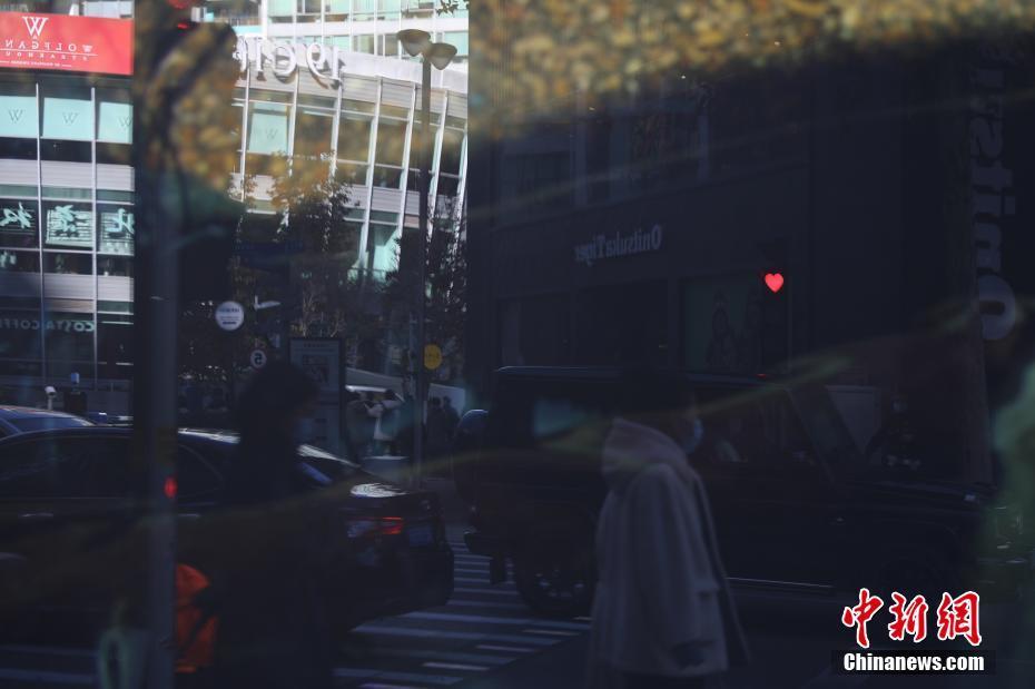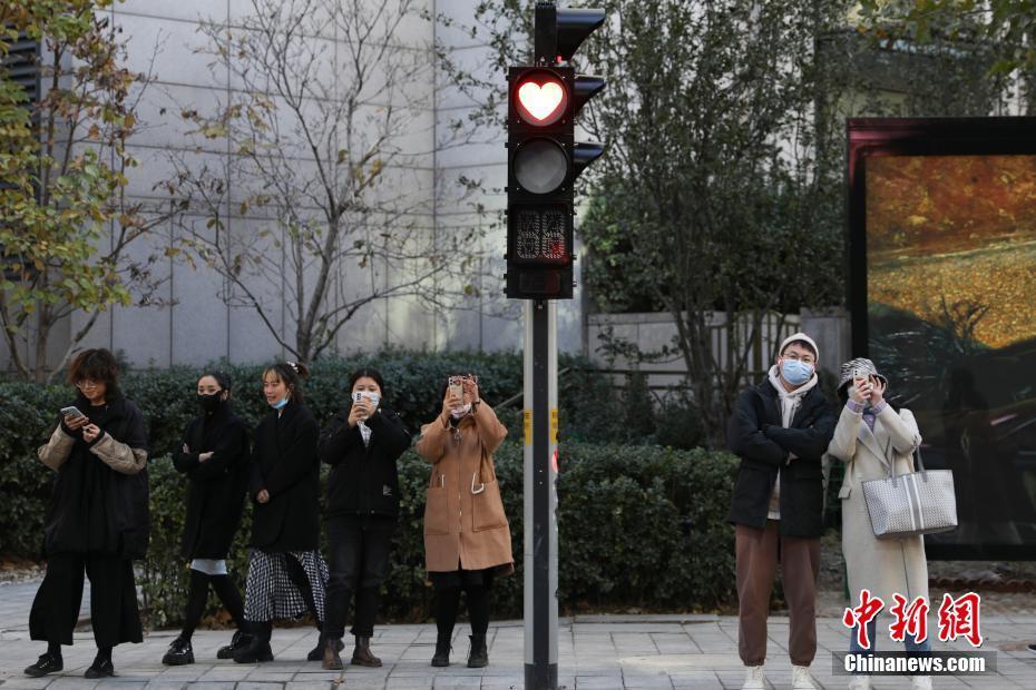 11月11日,“爱心”红绿灯吸引市民。近日,北京华贸中街的一路口红绿灯被设置成了“爱心”形状,吸引来往市民目光。 中新社记者 蒋启明 摄