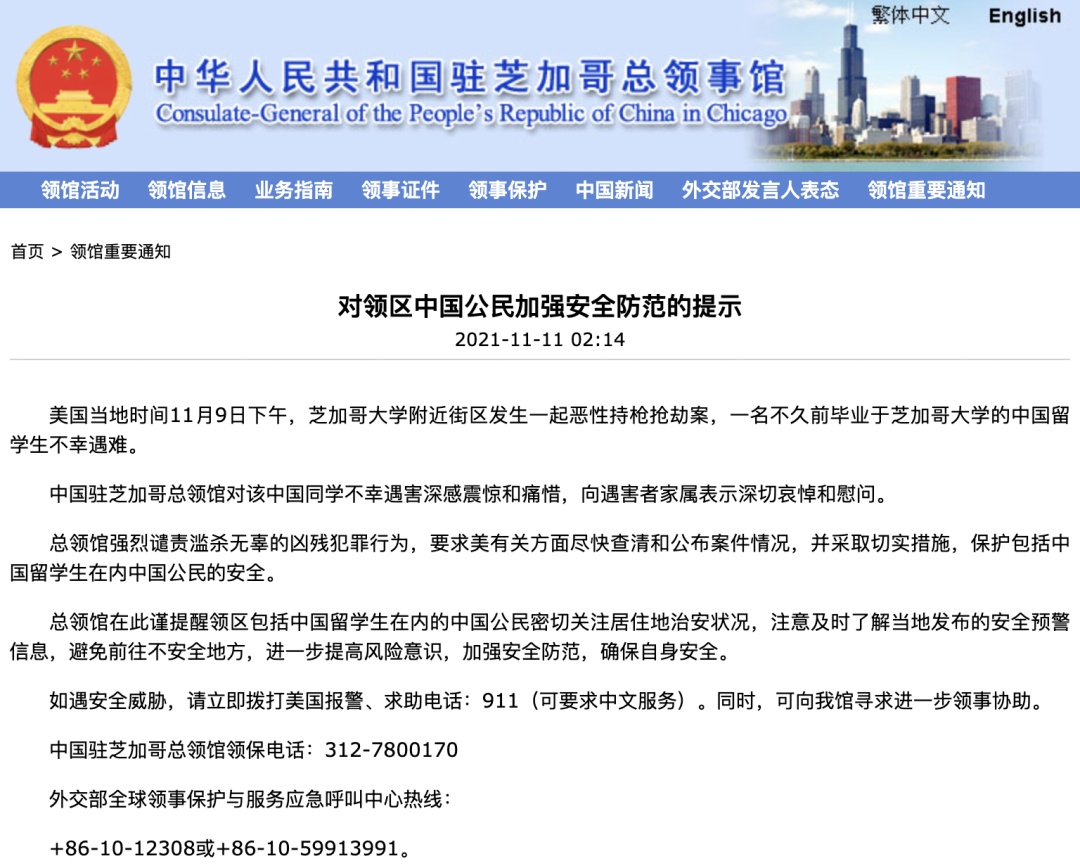 11日,中国驻芝加哥总领馆发布提醒,对该中国同学不幸遇害深感震惊和痛惜,向遇害者家属表示深切哀悼和慰问。