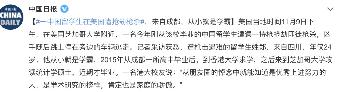 美国当地时间11月9日下午,芝加哥大学附近街区发生一起恶性持枪抢劫案,一名不久前毕业于芝加哥大学的中国留学生不幸遇难。