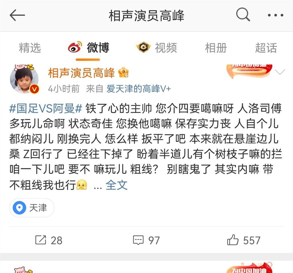 国足的“主场”比赛吸引无数中国球迷熬夜关注,这其中还有一位特殊球迷——德云社演员高峰。他也用谐音梗点评了这场比赛。“铁了心的主帅,您介四要噶嘛呀,人洛司傅多玩儿命啊,状态奇佳!您换他噶嘛?保存实力丧,人自个儿都纳闷儿, 刚换完人,恁么样,扳平了吧? 本来就在悬崖边儿桑,这回行了, 已经往下掉了, 盼着半道儿有个树枝子嘛的拦咱一下儿吧。 要不嘛玩儿粗线? 别瞎鬼了,其实内嘛, 带不粗线我也行。”