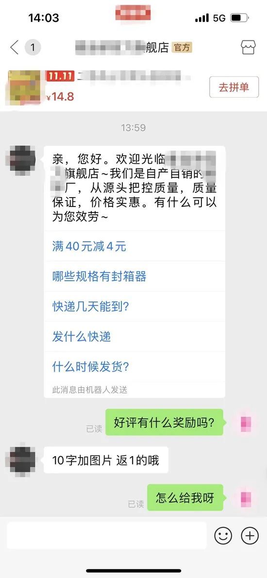 记者调查发现,目前多家电商平台上已屏蔽“好评返现”等关键词搜索,但联系一些商家客服后,就会得到“10字加图片返1”“返3”等回答,好评返现暗中存在。