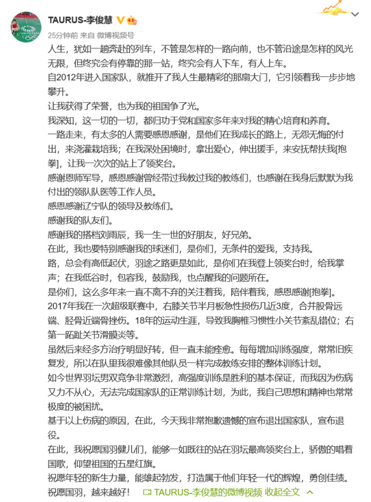 在宣布退役的同时,李俊慧感谢了国家的培养,以及一路以来帮助、栽培过他教练、工作人员、队友和球迷。他还表达了对老搭档刘雨辰的感激,以及对国羽年轻一代和队伍未来的期待。