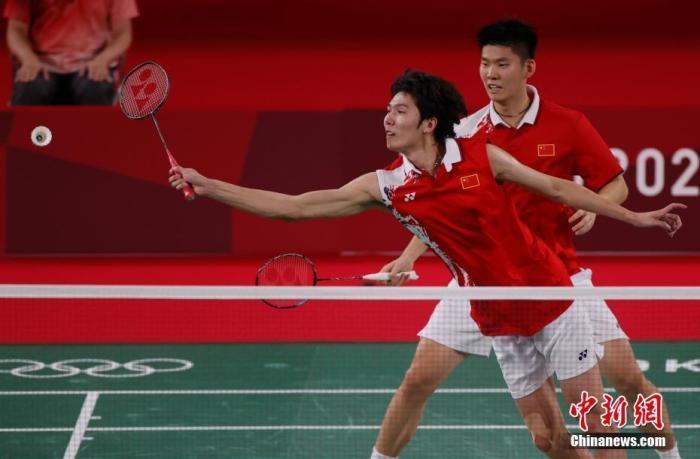 在东京奥运会羽毛球男子双打决赛中,中国组合李俊慧/刘雨辰以0:2负于中国台北组合李洋/王齐麟,夺得银牌。中新社记者 杜洋 摄