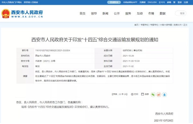 近日,西安市政府发布《西安市“十四五”综合交通运输发展规划》(以下简称《规划》),提出了西安将在2025年建成“交通强国典范城市”目标。根据规划,西安将打造一体化交通运输网,实现都市圈1小时通勤、城市群2小时通达、全国主要城市3小时覆盖。