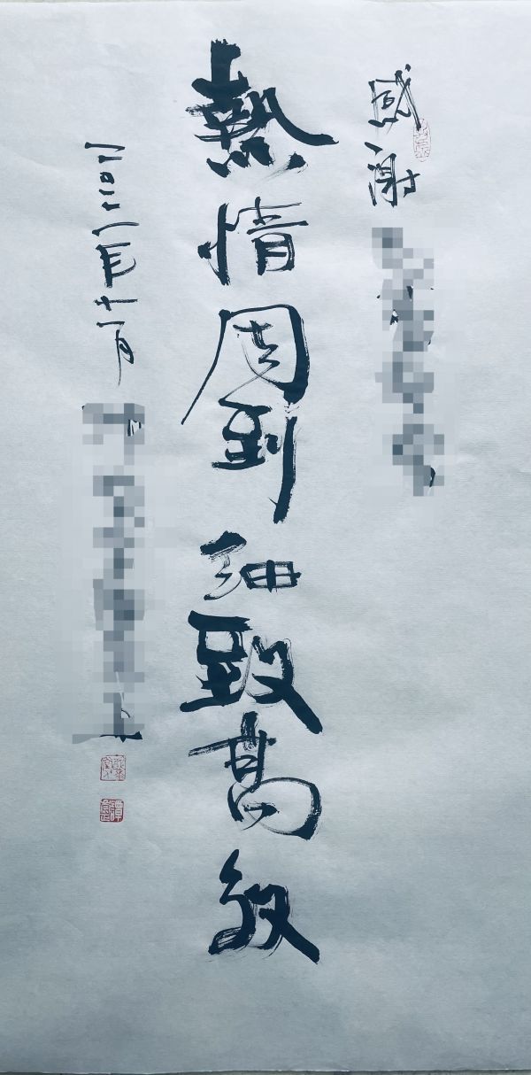 长江日报大武汉客户端11月13日讯(记者戴旻阳 通讯员孙逊)11月10日,大学老师谭先生来到武昌区政务服务中心公安窗口,办理落户业务的同时,还带来了一份特殊的“礼物”——一幅由他书写的“热情周到 细致高效”字样的书法作品。在艺术学院任职的他以手书锦旗的方式,感谢窗口民警帮其量身定制解决方案。