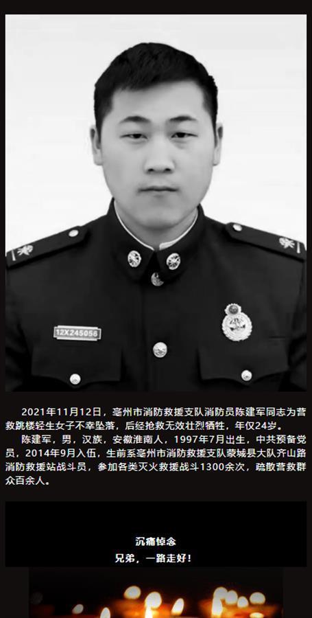 资料显示,陈建军,男,汉族,安徽淮南人,1997年7月出生,中共预备党员,2014年9月入伍,生前系亳州市消防救援支队蒙城县大队齐山路消防救援站战斗员,参加各类灭火救援战斗1300余次,疏散营救群众百余人。