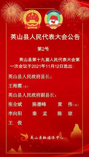 荆楚网(湖北日报网)讯(通讯员 吴滕钰)英山县第十九届人民代表大会第一次会议,选举产生新一届县政府领导班子,王海霞当选英山县人民政府县长,张全斌、陈德峰、黄伟、李向阳、秦孟、陈琼、王俊当选为英山县人民政府副县长。