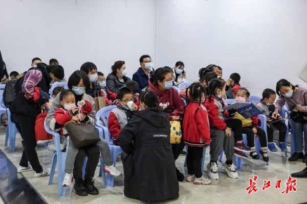 11日,武汉市金银潭医院新冠疫苗临时接种点,一所幼儿园组织家长带小朋友集体接种疫苗。 记者胡冬冬 摄