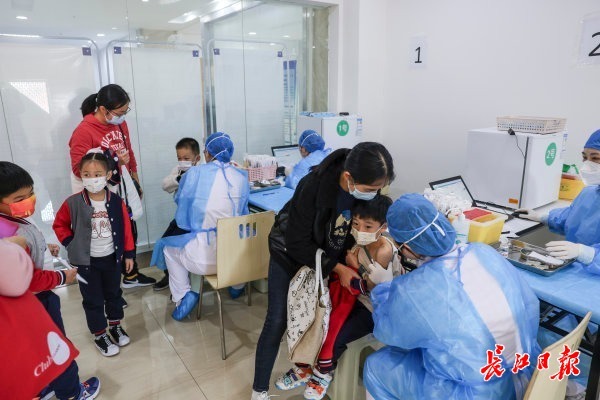 唐家墩街社区卫生服务中心工作人员介绍,社区加班加点开展疫苗接种工作,平均每天接种700~800人次,其中3~11岁小朋友占到一半,此外还有不少12岁以上错过集中接种的大孩子赶来接种,一些成年人也陆续接到通知来打“加强针”。
