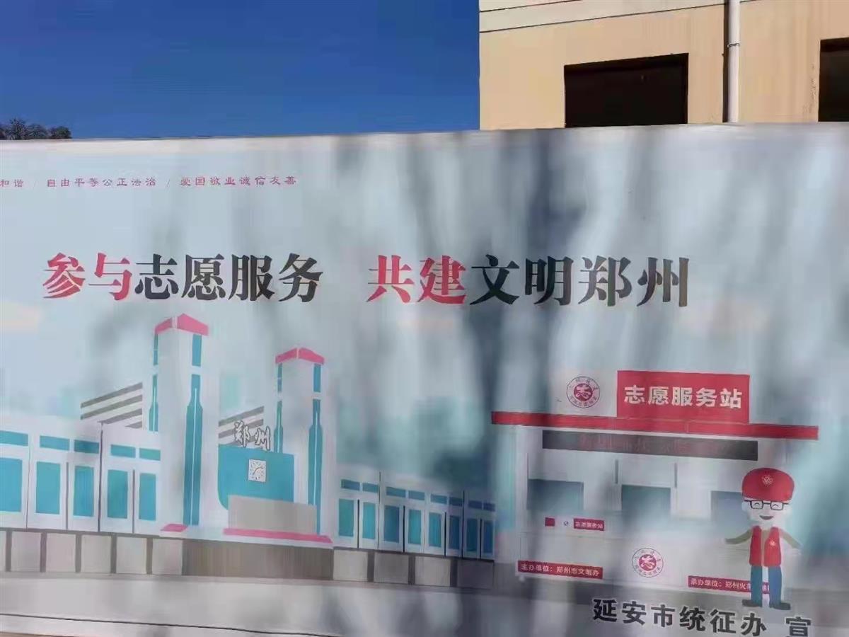 极目新闻记者注意到,在其中一幅宣传面上,“共建文明郑州”标语下方则是郑州的标志性建筑郑州火车站和志愿服务站,整幅海报的图案、文字全部以郑州为主题,但海报右下角的落款却为延安市统征办。