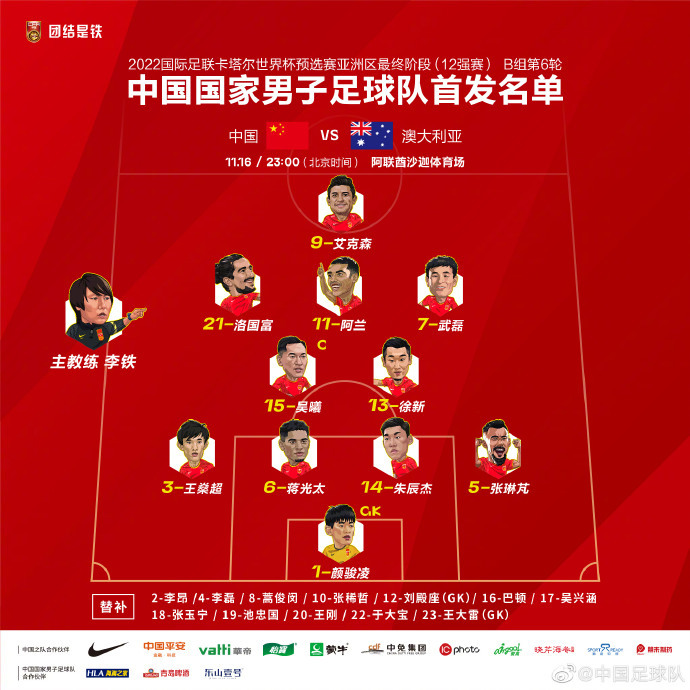 本场比赛,国足主帅李铁对首发阵容进行微调,艾克森顶替张玉宁出任单前锋,洛国富和阿兰继续首发,分别担任左前卫和前腰,武磊担任右前卫。