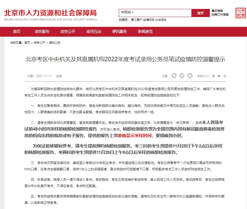 此外,考试防疫相关要求将根据国家和首都疫情防控措施规定的变化随时调整,请考生及时关注市人事考评办公室最新通知,并保持手机畅通,以免影响正常参考。