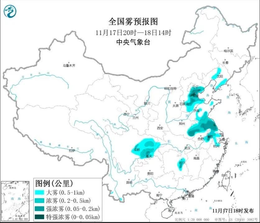 中央气象台17日18时继续发布大雾黄色预警,预计17日夜间至18日上午,北京、天津、河北、山东、河南、江苏、安徽、湖南、四川和辽宁等地的部分地区有大雾。其中,北京东南部、天津中南部、河北东部和南部、河南东南部、江苏中部、安徽北部等地的部分地区有能见度不足200米的强浓雾,局地能见度不足50米。