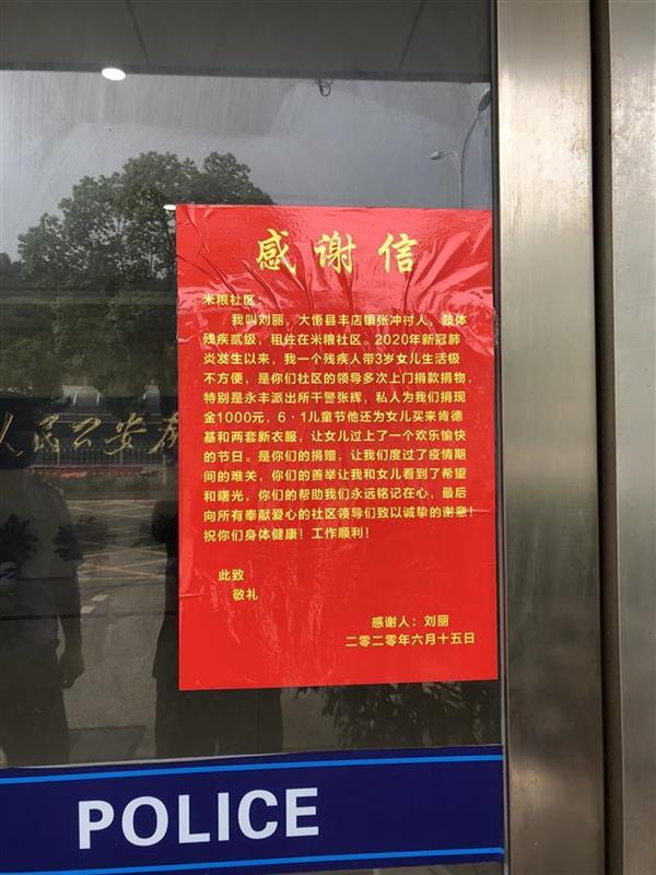 “这个感谢信我一定要亲手贴在你派出所的大门上,让更多群众看到永丰所有这样一位好警官。”去年6月,刘女士坐着轮椅来到永丰街派出所,送来锦旗和感谢信,致谢社区民警张辉一直以来对她们母女二人的帮助。