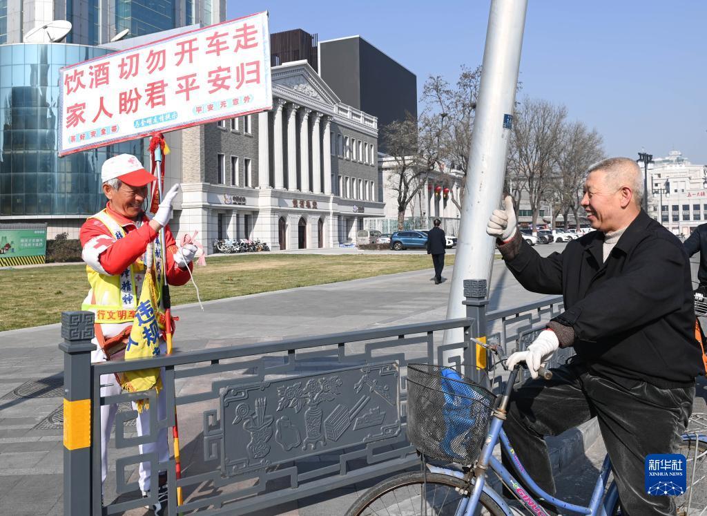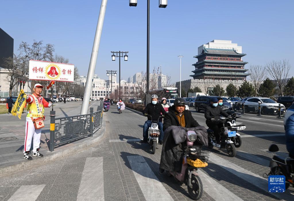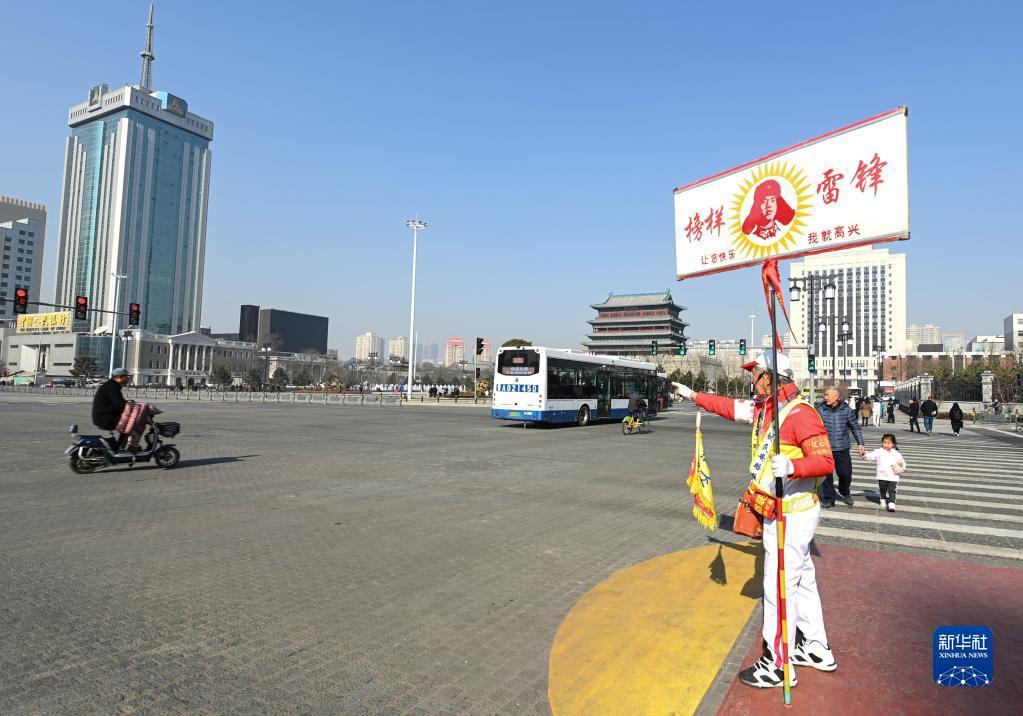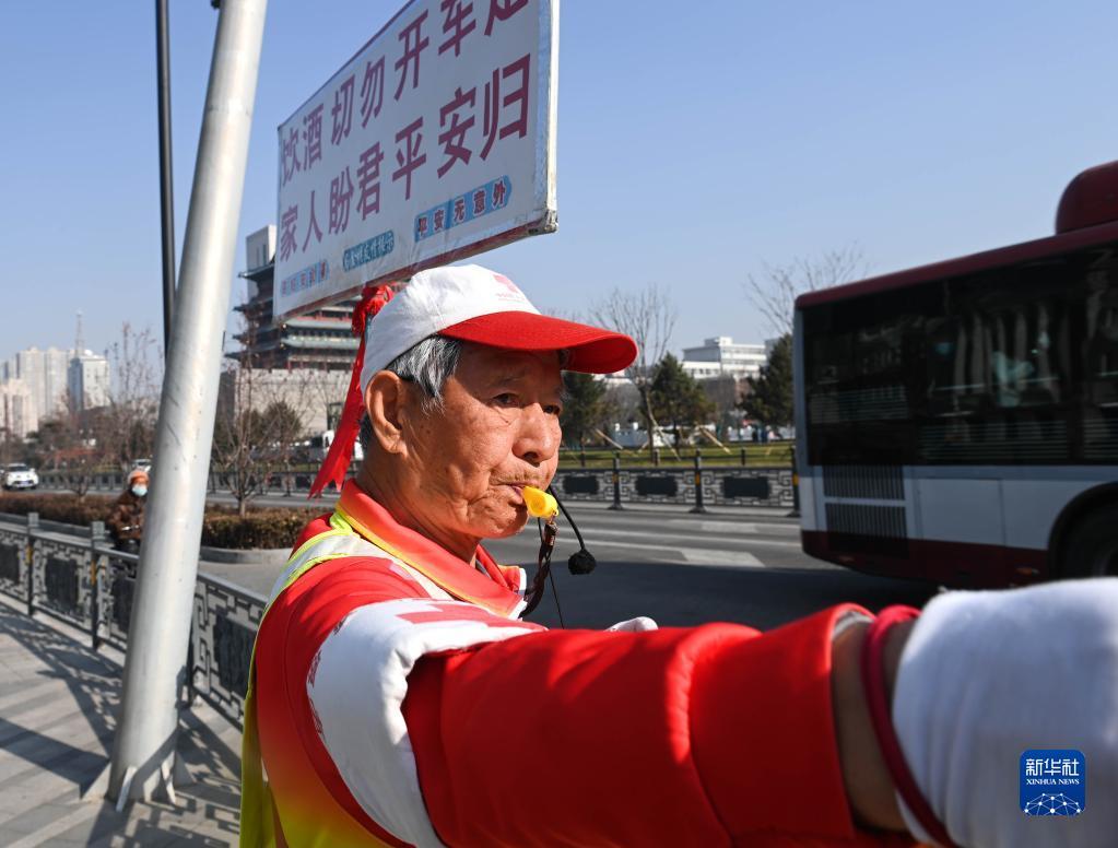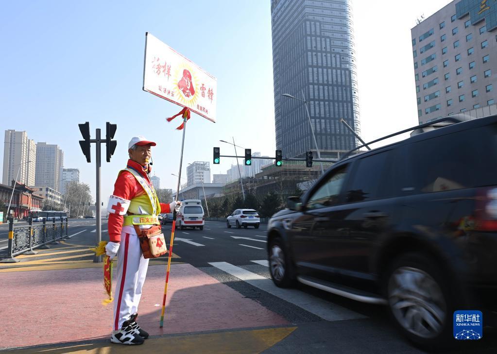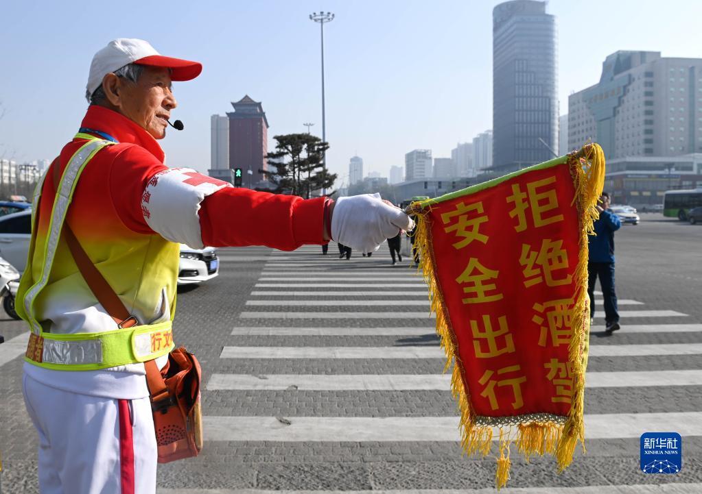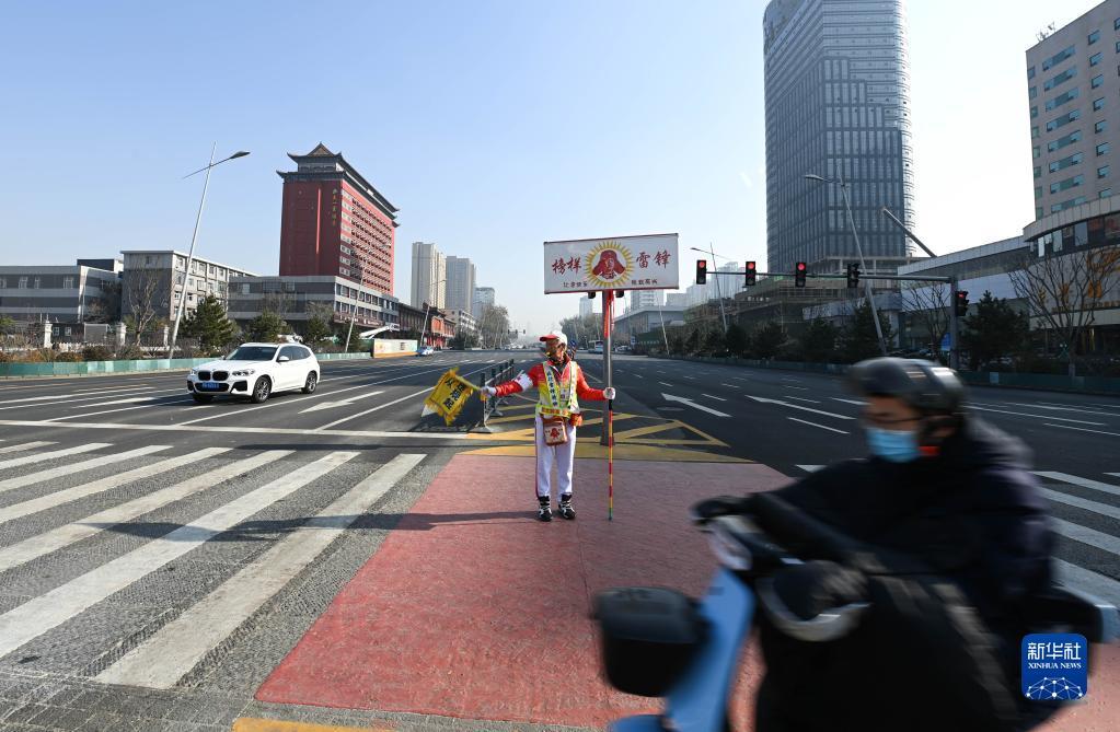 11月17日,在山西省太原市五一广场的路口,马金明劝阻不按指示灯行走的路人。
