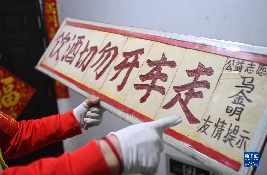 马金明展示他自制的安全提示牌(11月17日摄)。