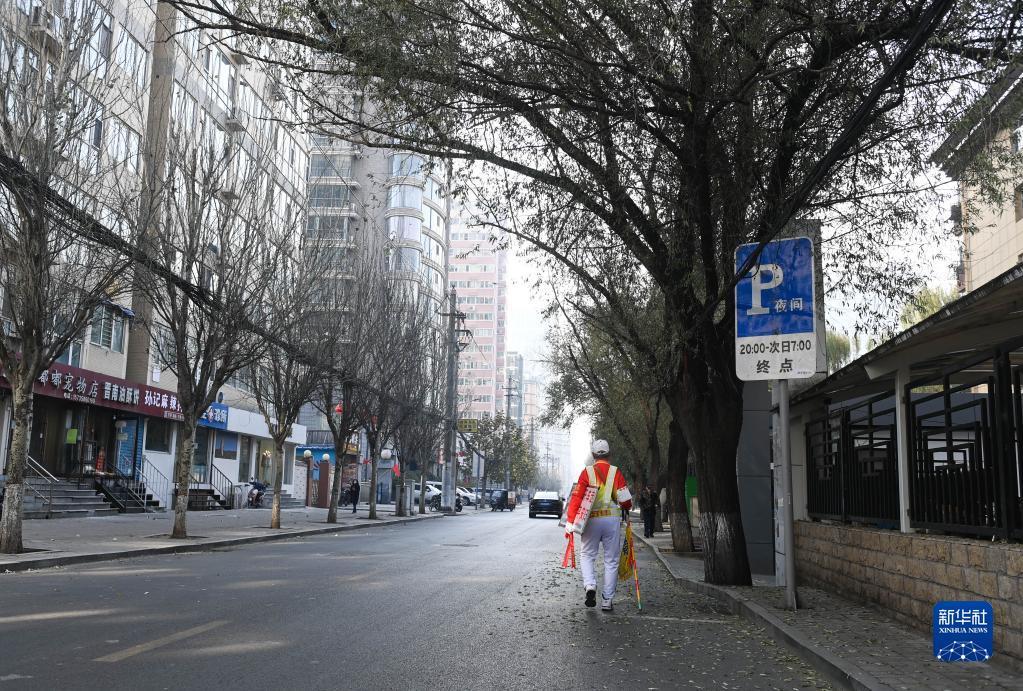 11月17日,在山西省太原市五一广场西北路口,马金明在路旁疏导交通。