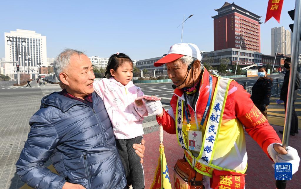 11月17日,在山西省太原市五一广场的路口,路过的孩子给马金明递上了自己的零食。