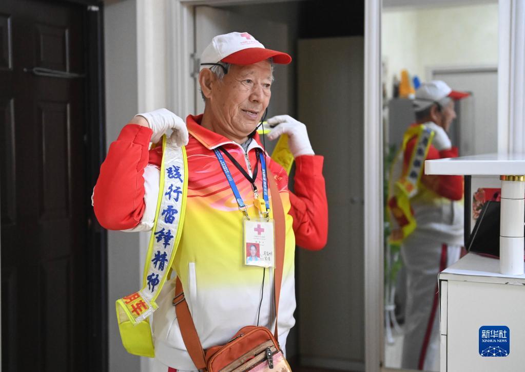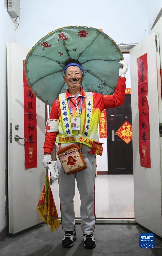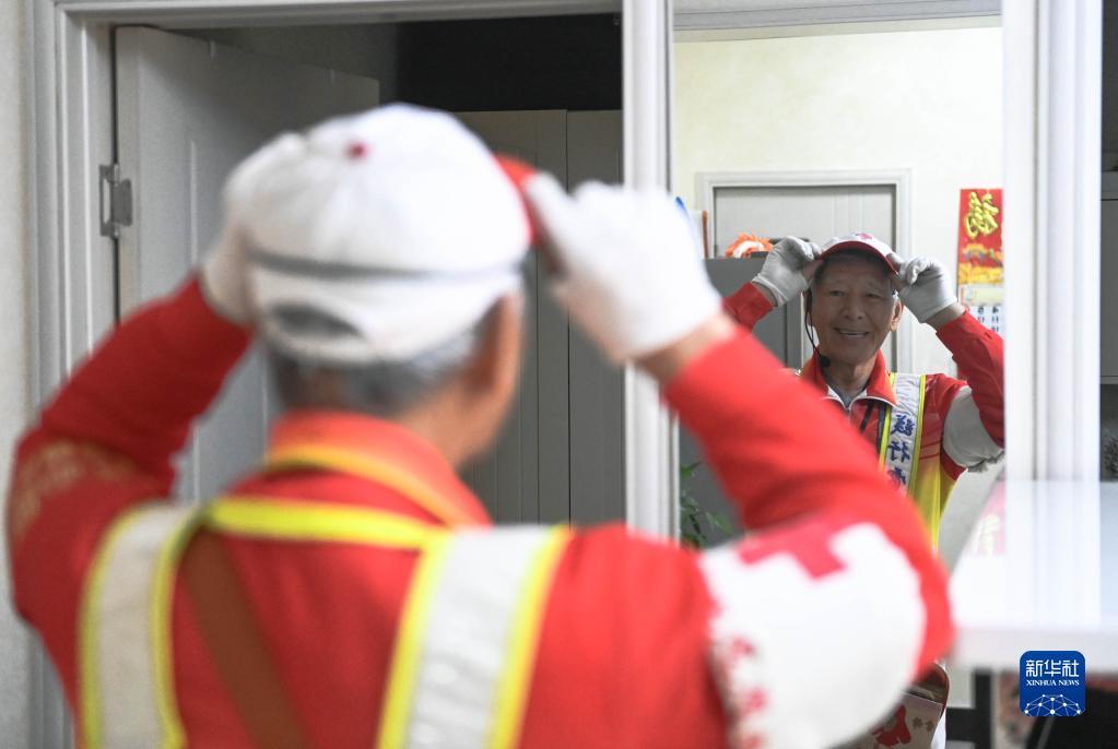 11月17日,马金明在家中穿戴好自备的疏导交通的装备,准备出发。