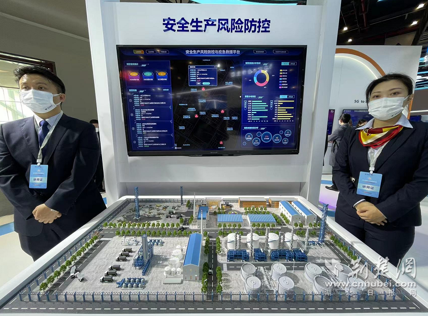 5G+化工行业展台,中国电信基于5G、大数据和人工智能技术,以数字孪生为基座,实现智能值守、风险评估、监测预警、高效处置等功能,助力5G+智慧安全园区建设。通过5G+智慧安全园区建设,实现了从预防与准备、监测与预警、处置与救援的全链条服务,从而推进安全生产治理体系和治理能力现代化建设,全面提升园区本质安全水平。