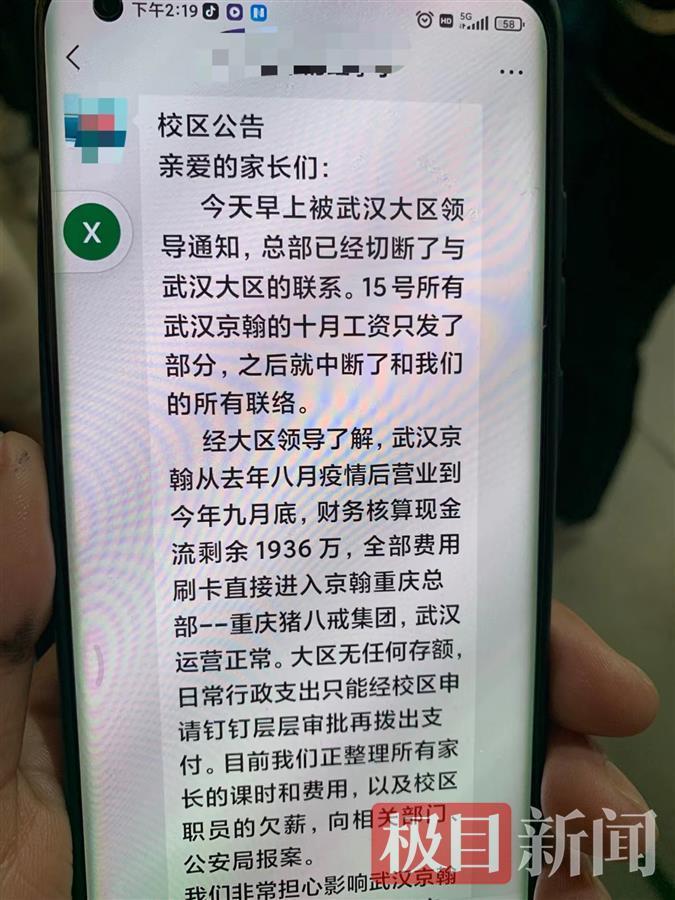 极目新闻记者注意到,京翰教育徐东校区发给家长们的公告显示:“今天(17日)早上被武汉大区领导通知,总部已经切断了与武汉大区的联系。15日所有武汉京翰的十月工资只发了部分,之后就中断了和我们的所有联络。”