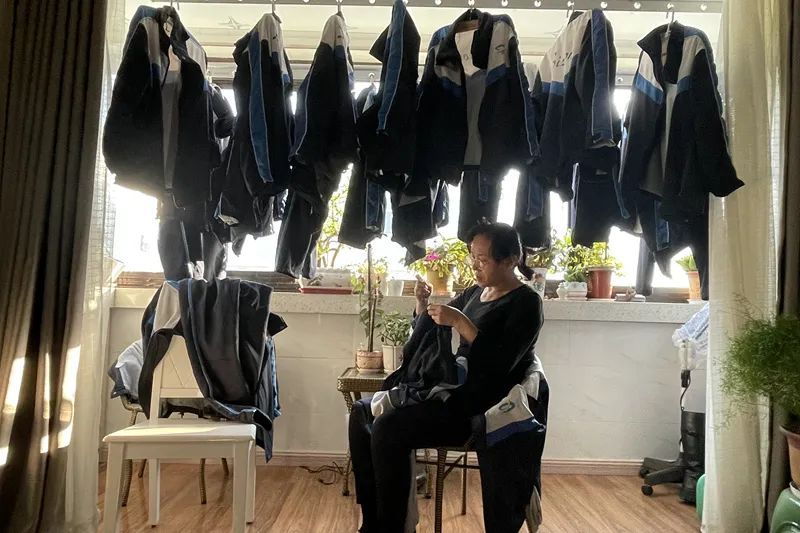 坐在挂满校服的阳台上缝补衣服的照片