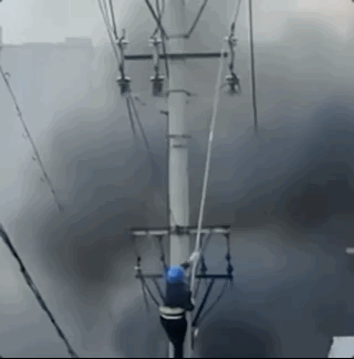 电力工作人员爬上燃烧的电线杆