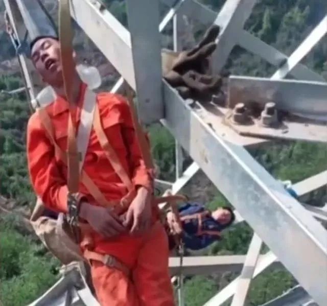 倚靠在电塔的铁架上闭眼休息