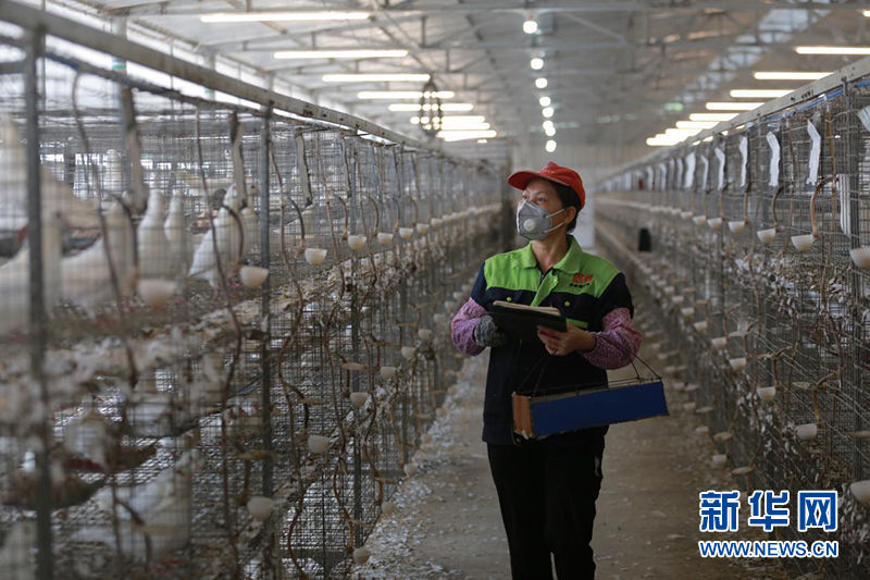新海府生态鸽养殖基地饲养员王桂玉在鸽棚里观察记录乳鸽生长状态。