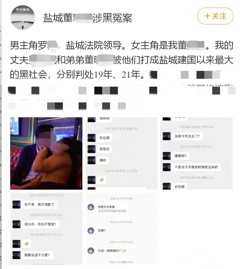 11月21日,网名为“盐城董明明涉黑冤案”的网友发帖称,其丈夫和弟弟因涉黑相关案件被盐城一法院分别判处19年、21年,此后该网友家房屋被查封,三个小孩流离失所,被迫成为法院领导“玩物”。并附带一张男女亲密举动的照片,以及相关聊天记录截图。