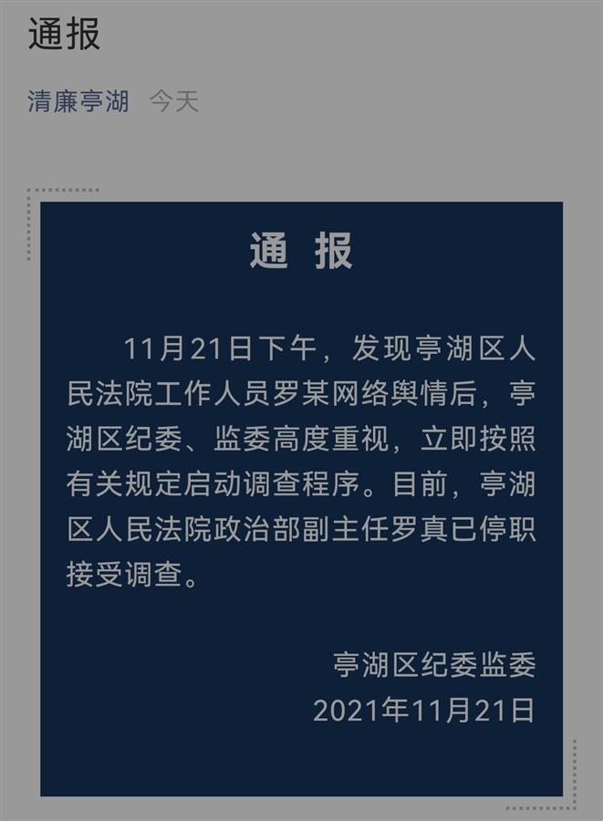 11月22日早上,亭湖区纪委通报称:11月21日下午,发现亭湖区人民法院工作人员罗某网络舆情后,亭湖区纪委、监委高度重视,立即按照有关规定启动调查程序。目前,亭湖区人民法院政治部副主任罗真已停职接受调查。