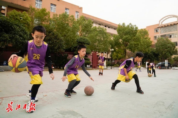 北湖小学的运动场上,也多了一群专注、认真的学生。武术班的同学跟着老师学习一招一式,足球队队员穿上不同颜色的球衣分小组练起基本功,篮球场上的男生和女生细抠技术动作,“咚咚”的拍球声释放着他们的活力。