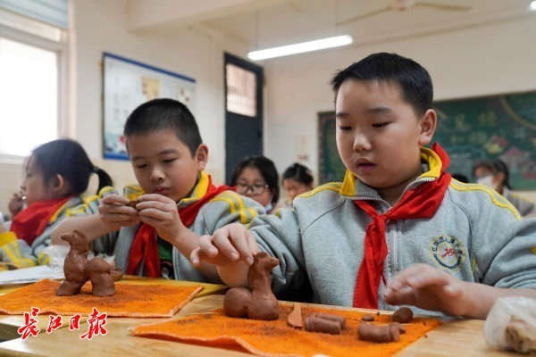 给孩子们上泥塑课的,是武汉民间艺术家协会会员、武汉泥塑第二代非遗传承人封颖、张露文。北湖小学副校长李雪梅介绍,为了给学生提供丰富且专业的教学,学校不仅挖掘本校有特长的教师,还引进了校外资源,如华中师范大学知行实践教育研究院的“乐实践”系列课程,武汉市武术协会教练、非遗传承人也被请进校园。这学期,学校不仅开设了泥塑、剪纸、棉絮画三个非遗课后服务项目,还与江汉区非遗中心合作,开展汪玉霞月饼制作、汉派插画两个专题活动。