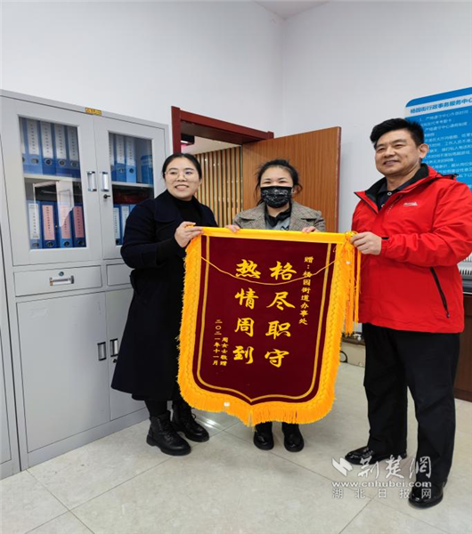 荆楚网(湖北日报网)讯(记者李燕 通讯员彭莉)11月22日,武昌区杨园街道行政服务中心收到一面写有“恪尽职守 热情周到”的锦旗,辖区居民周女士对工作人员为群众办好事的行为赞口不绝,对政务中心的服务也提出表扬。